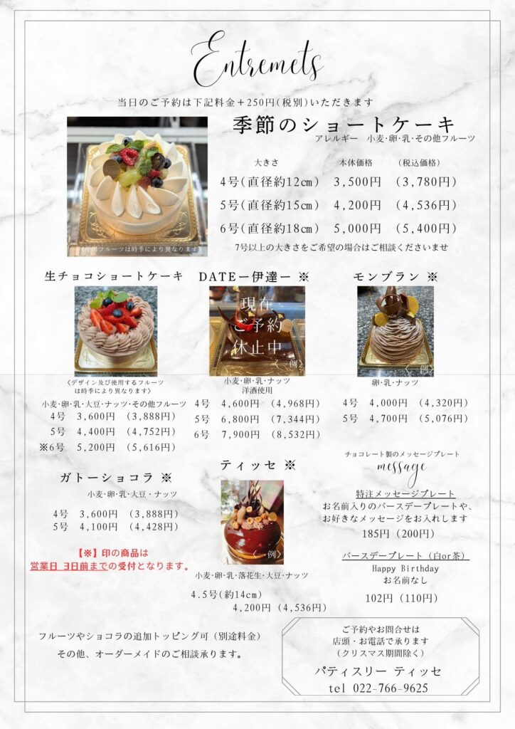 2025.10.19 アントルメ メニュー(10月19日現在) ショップからのお知らせ 【 写真のデザインやフルーツは一例になります。 】当日はシェフおまかせになりますので何卒ご了承くださいませ。※苦手なフルーツやご希望等ございましたらご予約時にお申し付けください。※『DATE』は原材料ウィスキーの入荷が不安定により現在ご予約を休止しております。