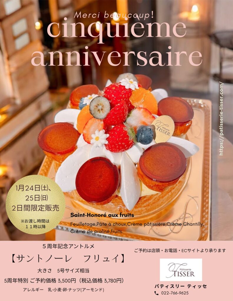 2026.01.16 【御礼】5周年記念アントルメ 1/24,25限定販売 ※EC受付終了しました ショップからのお知らせ (1/23追記) ECサイトでの受付は終了しました。~~~~~~~~~おかげさまでパティスリーティッセは5周年を迎えました。日頃よりご愛顧を賜り、心から感謝申し上げます。毎年ご好評いただいております記念アントルメですが、この度は5周年というお祝いに相応しい『サントノーレ·フリュイ』をご用意いたします。是非ご予約の上ご賞味くださいませ。インターネットでのご予約はこちらから承ります。